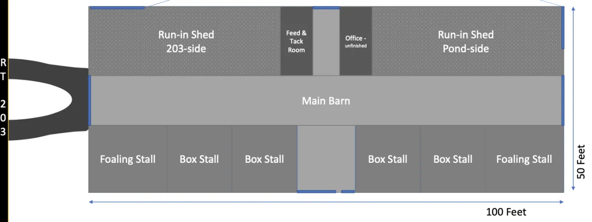 50’ x 100’ primary barn with 6 stalls and room for 12+ stalls