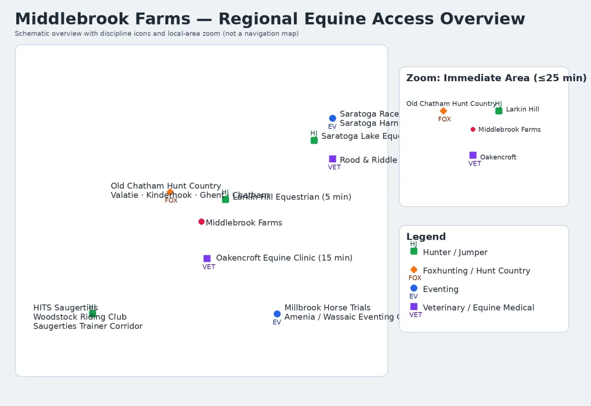 Middlebrook Equestrian is located within a dense professional equine ecosystem, offering practical driving access to competition venues, hunt country, and veterinary services that support a full-time training operation.